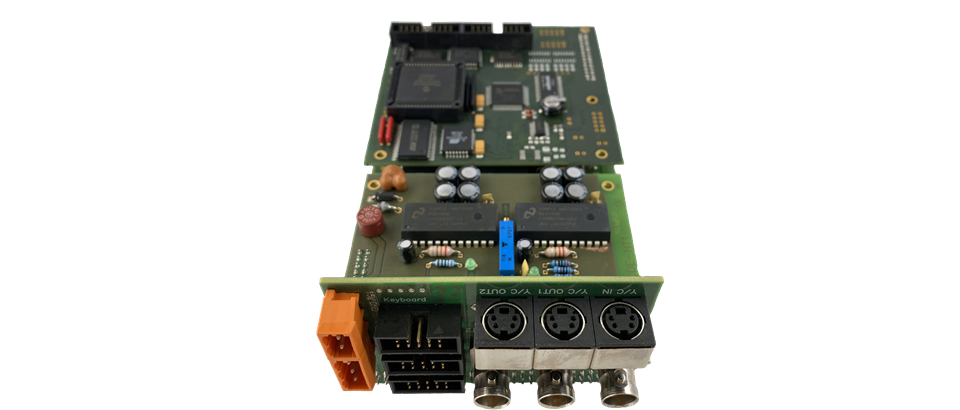 Mit der Option PCI wird das Einplatinen-Farb-DE µCDE zu einer kompakten Steckbaugruppe für Computer mit PCI-Slots. Hierbei erfolgt über den PCI-Bus lediglich die Versorgng der DE, alle Schnittstellen, der Inkremental-Enkoder-Eingang und Video In/Out stehen an den Slotblechen zur Verfügung. Die Baugruppe belegt zwei Steckplätze.