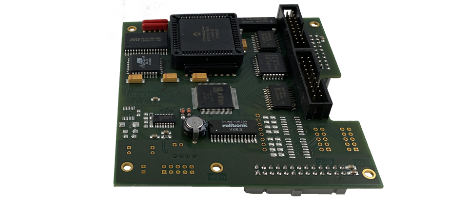 Die Option µCIO für das Einplatinenfarb-DE µCDE wird rechts auf die Baugruppe µCDE gesteckt. Es ist eine universelle I/O-Baugruppe und erweitert die DE µCDE um zwei Schnittstellen RS-232, einen weiteren autonomen Meterzähler, einen NV-Speicher für Meßwerte (Neigungsprofil), einen Video-Multiplexer (Satellit), einen Video-Buffer, einen Video-Daten-Empfänger und digitale I/O. Mit einer speziellen Software wird diese Baugruppe optimal an die TV-Anlage adaptiert.